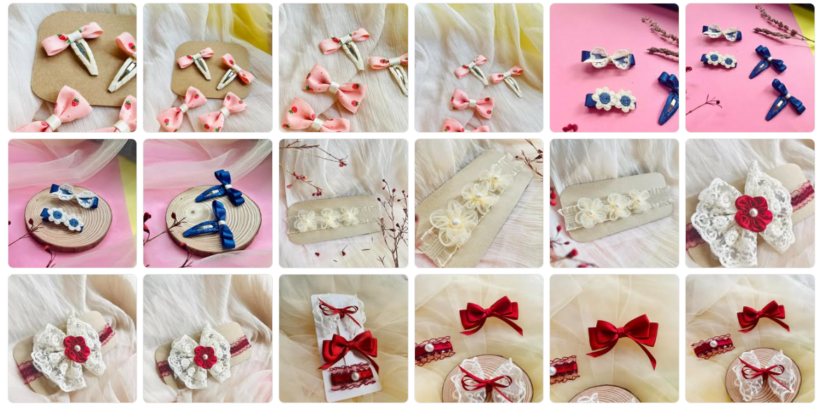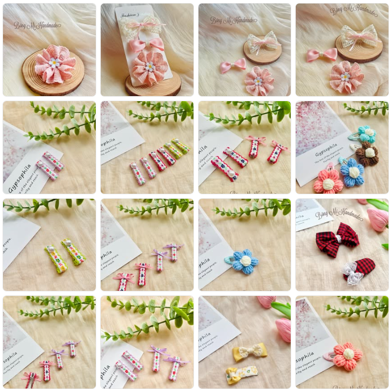 - Kẹp tóc handmade: đa dạng từ kẹp nơ cổ điển, kẹp vải vintage, đến kẹp ren công chúa.
